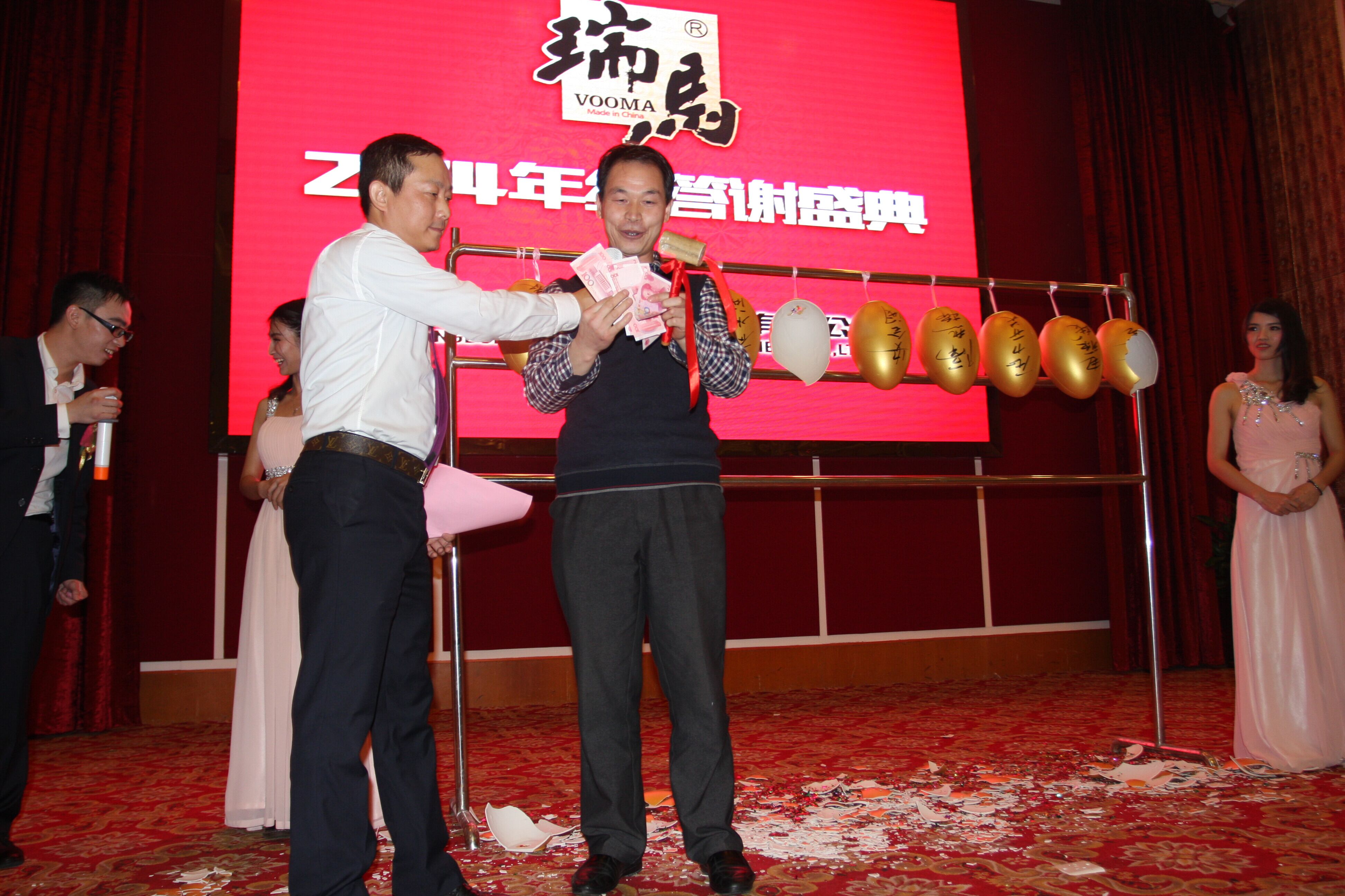 節(jié)目表演完后,當(dāng)然是來到我們最刺激,最期待的砸金蛋抽獎環(huán)節(jié)!看著一個個金蛋搬上臺,大家眼睛都閃亮亮的!沒錯,瑞馬公司就是那么任性,讓您砸的就是一個真正的金蛋,里面可是那人見人愛 “白花花”的人民幣!