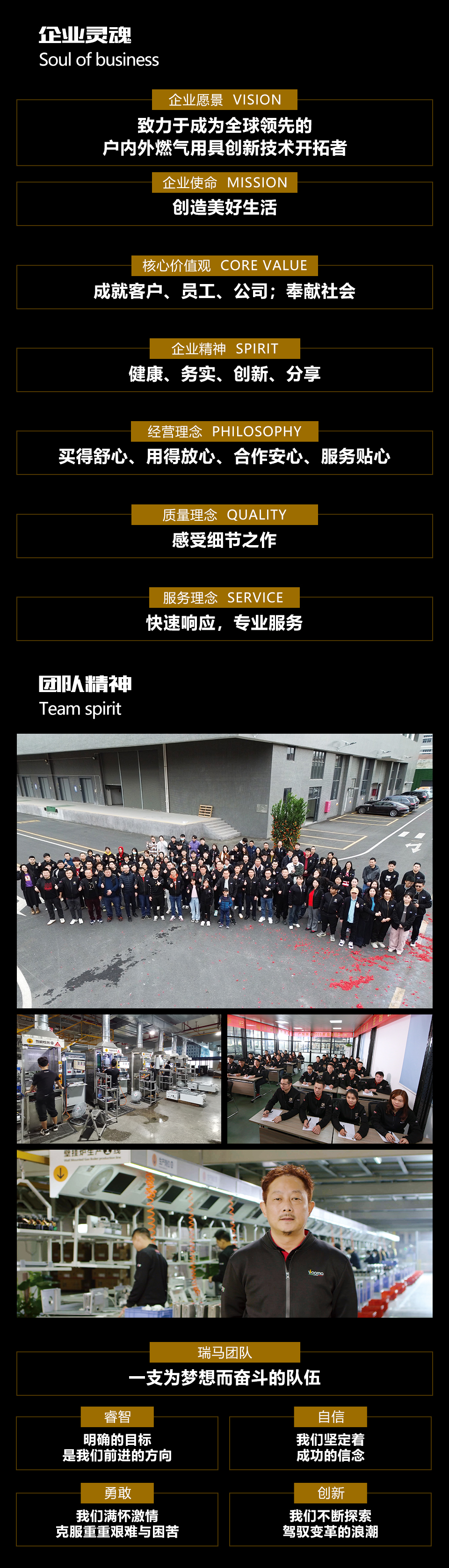 廣東瑞馬以“致力于成為全球領(lǐng)先的戶內(nèi)外燃?xì)庥镁邉?chuàng)新技術(shù)開拓者”為企業(yè)愿景,秉承“健康、務(wù)實(shí)、創(chuàng)新、分享”的企業(yè)精神,堅(jiān)持“成就客戶、成就員工、成就公司、奉獻(xiàn)社會(huì)”的核心價(jià)值觀,堅(jiān)守“感受細(xì)節(jié)之作”的質(zhì)量理念,以“買得舒心、用得放心、合作安心、服務(wù)貼心”為經(jīng)營(yíng)理念,以“快速響應(yīng)、專業(yè)服務(wù)”為服務(wù)理念,立足燃?xì)獠膳?熱水行業(yè),深耕燃?xì)鈶?yīng)用技術(shù),進(jìn)軍戶外燃?xì)饩哳I(lǐng)域,打造閉環(huán)“智造”工廠,以創(chuàng)新創(chuàng)造美好生活。