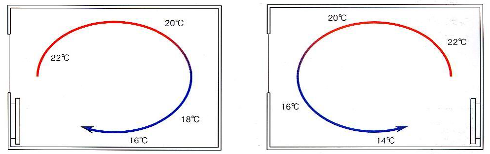 安裝位置的選擇:最佳的安裝位置為窗戶底部或者冷墻壁上(見圖3-1)。雖然這樣做會增加房間的熱量損失,但是這樣能夠使熱量在室內(nèi)的分布更加均勻,使室內(nèi)更加舒適(散熱器安裝位置對室內(nèi)溫度分布的影響見圖3-2)。