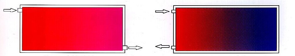 連接方法的選擇:散熱器的進、出口成對角線時,它的散熱效果最佳。當散熱器長度小于1米時,它的進、出口也可以在同側(cè)室安裝。(見圖3-3 .3-4)